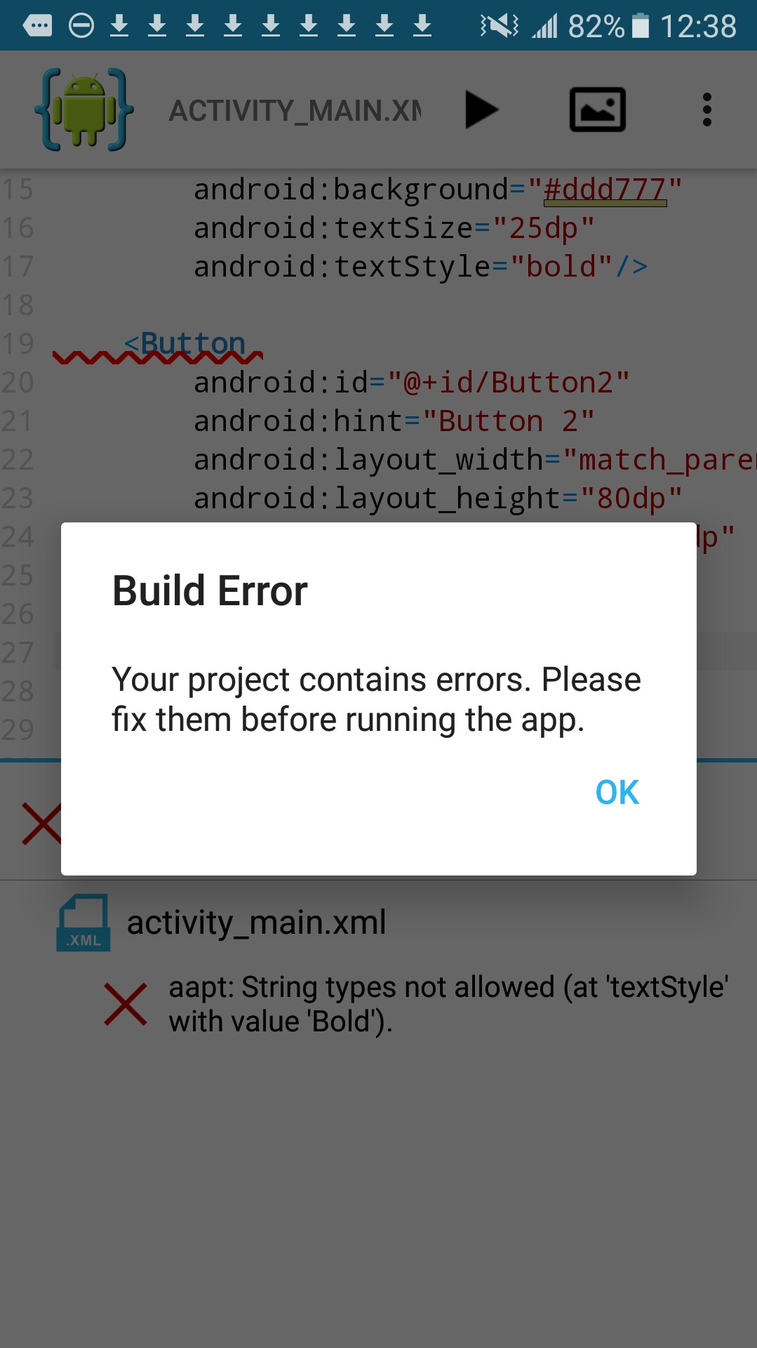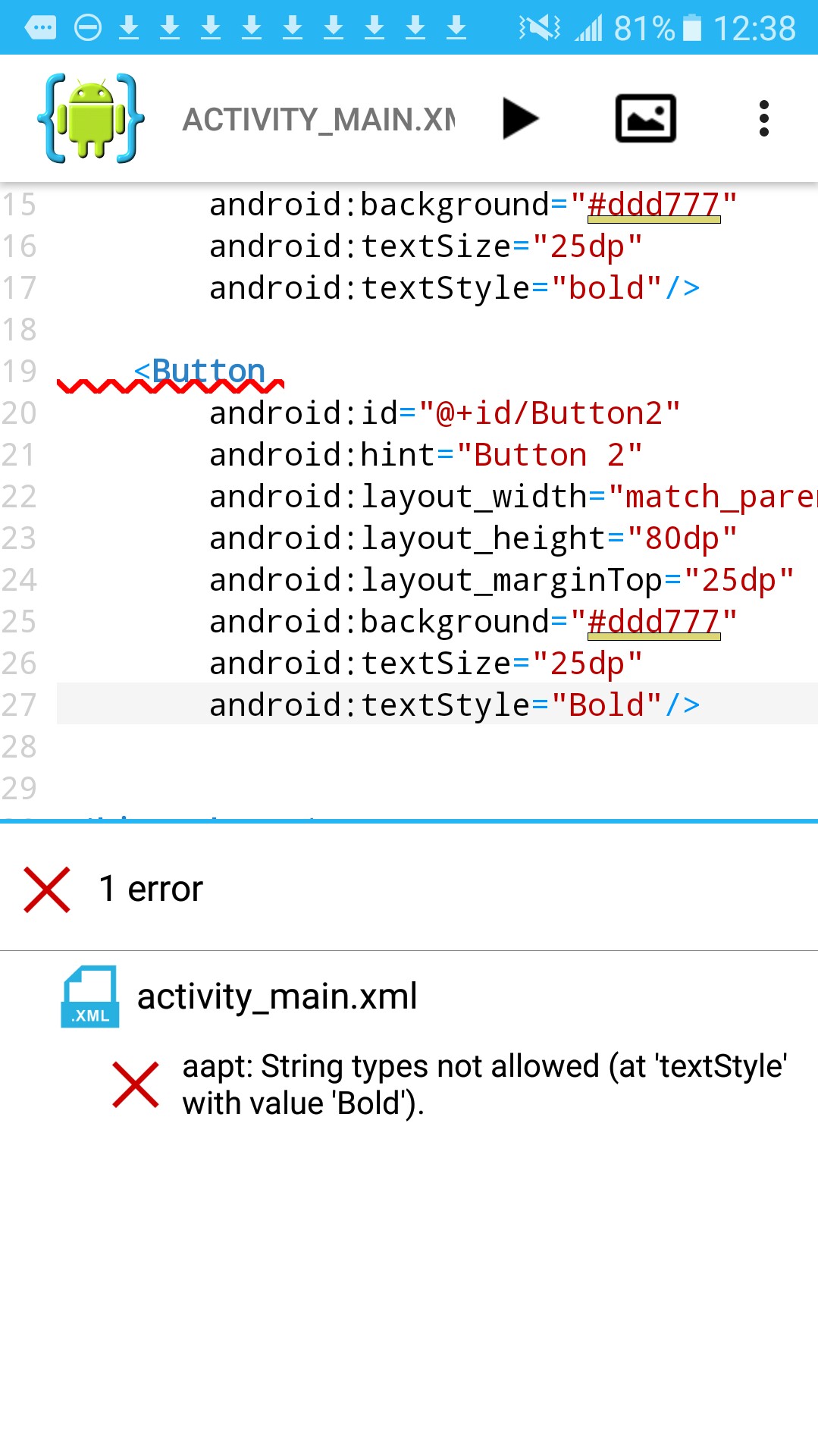 In this error message; it is saying the error is at activity_main.xml, and that the string type , textStyle Bold, is not allowed. The actual error is the B in Bold, it should be lowercase - bold. Caps are not allowed in a value.