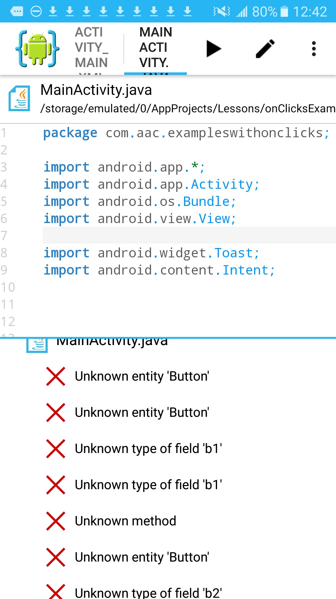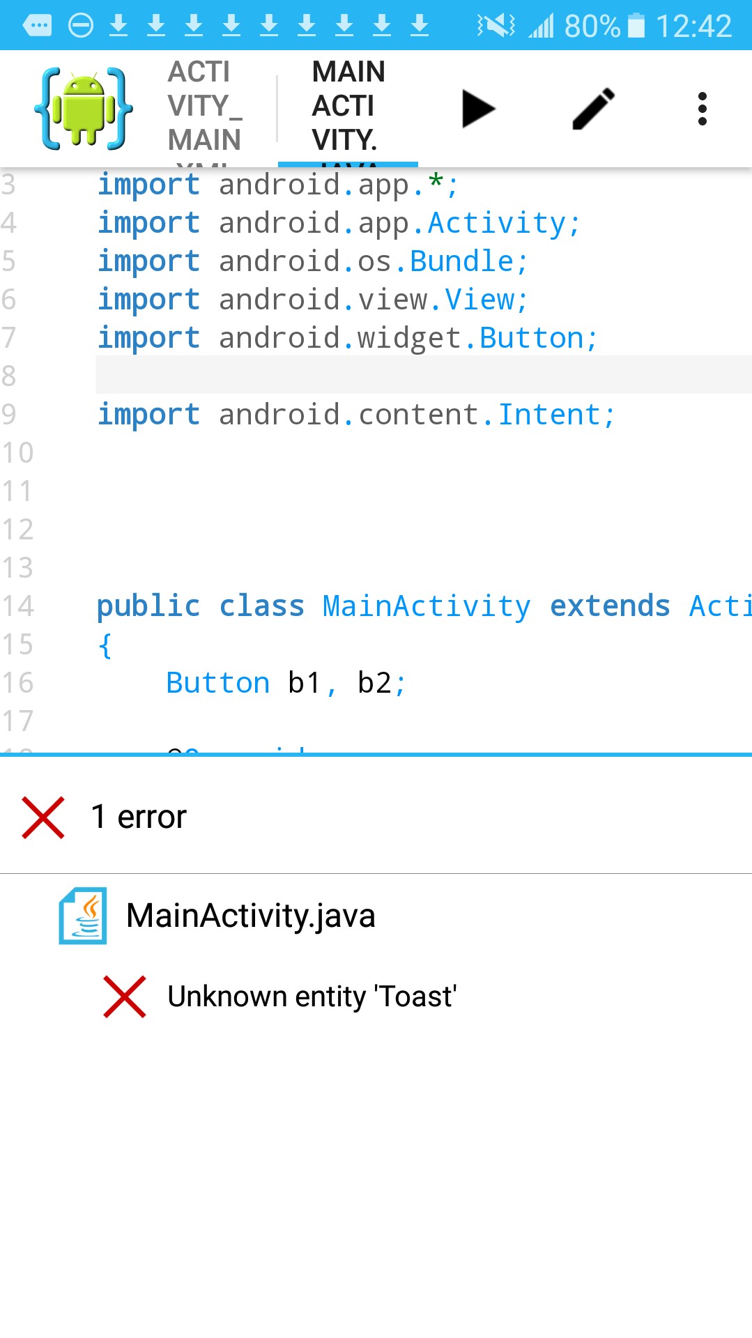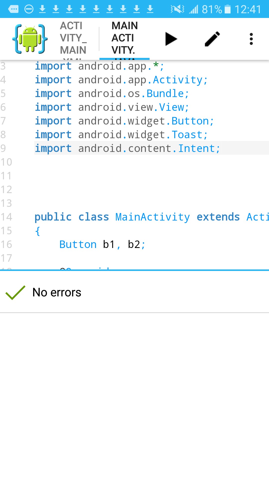 This image shows the Toast and Button imports included as they should be. We now see a 'no errors' message once we Save our page after adding them. We can now Run our app without issue.