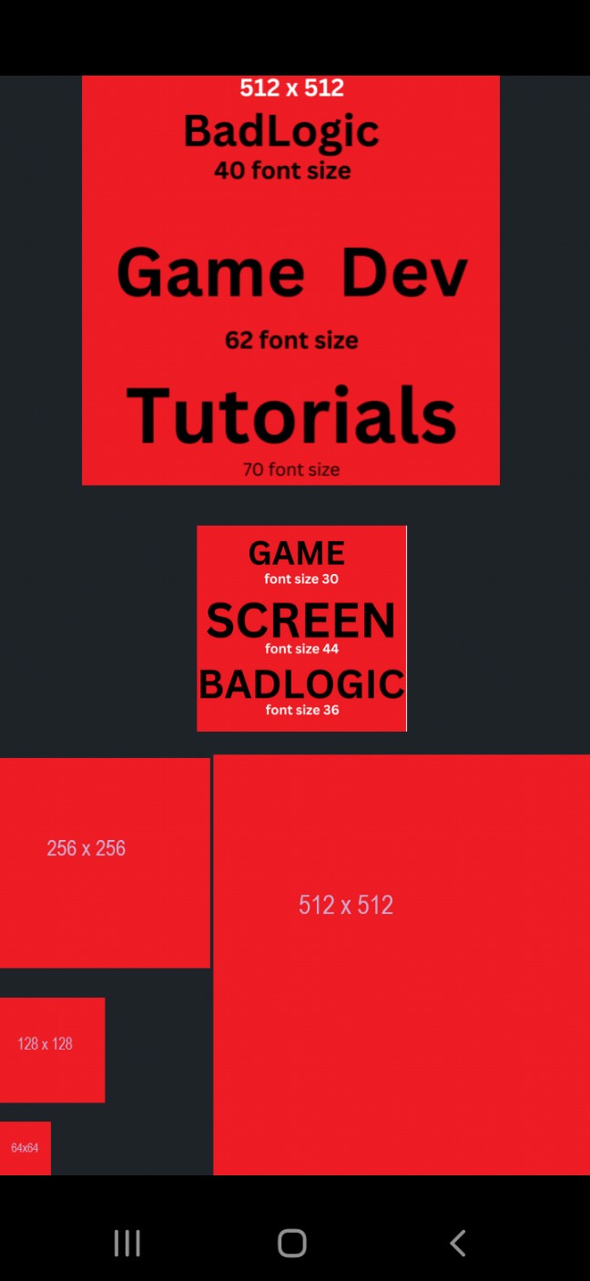 The 4 images placed at the bottom of the screen show the sizing of 64x64, 128x128, 256x256, and 512x512. The top 2 images, show the font sizes for the text that is written on the image. So, the top image, at text 'Game Dev' has a font size of 62. If you wanted to have this size of text on your game screen you would use the 62 font size when coding the font, or making a image with the font size added to it. Remember, this is a 5.8" screen, so if you were looking to code this on a smaller or larger device screen, the image would have to scale to those screen device sizes.