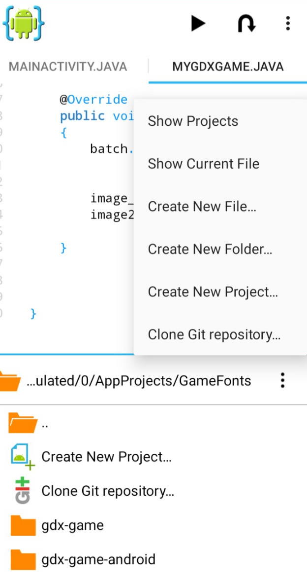 MyGdxGame.java to open it in the AIDE coding editor. To go back in the file hierachy just select at the top of files, the little orange file folder; and keep clicking it till you get to the folder you want. And, to view the files hierachy at anytime; you can also select the middle of screen dots in AIDE, select 'Show Projects', and then select the app project you want from the list. And, lastly just click the folders until you get to the folder or file you want.
