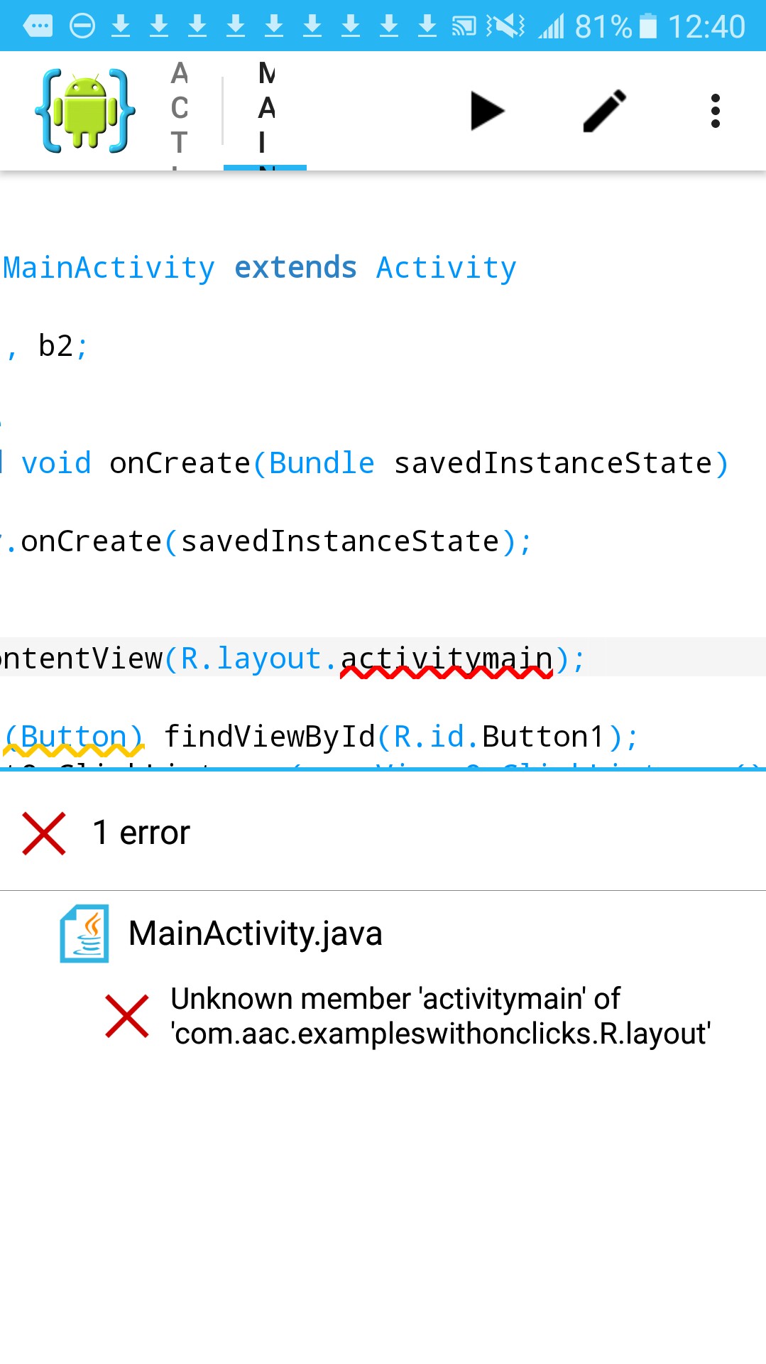 This next error is at the page MainActivity.java; and says 'activitymain' is an unknown member. This means it doesn't recognize the activitymain. The word was spelled incorrectly; should be 'activity_main'.